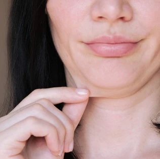 weniger Spannkraft weshalb die Haut vor allem an den Wangen und dem Hals erschlafft (die Haut am Unterkiefer ist eingefallen und ein “Doppelkinn” entsteht).